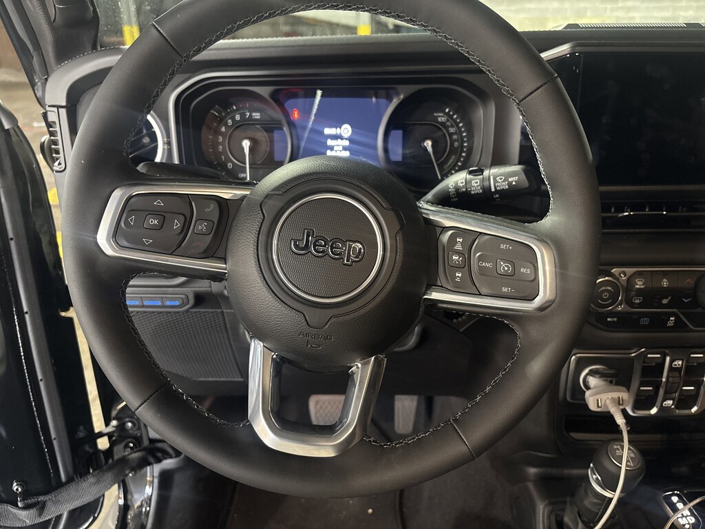 2.0L I4 DOHC, #1 Seat Foam Cushion, 12.3" Touchscreen Display, 3.73 Rear Axle Ratio, 4-Wheel Disc Brakes, 4G LTE Wi-Fi Hot Spot, 8 Speakers, A/C Power Box Inverter (PHEV), ABS brakes, Air Conditioning, Alloy wheels, Alpine Premium Audio System, AM/FM radio: SiriusXM, Apple CarPlay, Apple CarPlay/Android Auto, Auto High Beam Headlamp Control, Auto-Dimming Rear-View Mirror, Automatic temperature control, Blind Spot & Cross Path Detection, Body Color 3-Piece Hard Top, Brake assist, Cigar Lighter, Cloth Low-Back Bucket Seats, Compass, Connected Travel & Traffic Services, Connectivity - US/Canada, Delay-off headlights, Disassociated Touchscreen Display, Driver door bin, Driver vanity mirror, Dual front impact airbags, Dual front side impact airbags, Electronic Stability Control, Emergency communication system: Jeep Connect, EV/PHEV Vehicle To Load, For More Info, Call 800-643-2112, Freedom Panel Storage Bag, Front anti-roll bar, Front Bucket Seats, Front Center Armrest w/Storage, Front dual zone A/C, Front fog lights, Front License Plate Bracket (DISC), Front reading lights, Fully automatic headlights, Google Android Auto, GPS Navigation, Hard Seat Back, HD Radio, Heated door mirrors, Heated front seats, Heated steering wheel, Illuminated entry, Integrated Center Stack Radio, Integrated Off-Road Camera, Integrated roll-over protection, Integrated Voice Command w/Bluetooth, Leather Wrapped Park Brake Handle, Leather Wrapped Shift Knob, Low tire pressure warning, McKinley Trimmed Seats, Occupant sensing airbag, Outside temperature display, Overhead airbag, Panic alarm, ParkSense Rear Park Assist System, ParkView Rear Back-Up Camera, Passenger door bin, Passenger vanity mirror, Power 4-Way Driver Lumbar Adjust, Power 4-Way Passenger Lumbar Adjust, Power Adjust 8-Way Driver Seat, Power Adjust 8-Way Front Passenger Seat, Power door mirrors, Power steering, Power windows, Quick Order Package 29P Sahara 4xe, Radio data system, Radio: Uconnect 5 Nav w/12.3" Display, Radio: Uconnect 5 w/12.3" Display, Rear anti-roll bar, Rear reading lights, Rear seat center armrest, Rear Window Defroster, Rear Window Wiper/Washer, Remote keyless entry, Removable Ash Tray, Sahara Popular Equipment Group, Security system, Side Steps, SiriusXM Radio Service, SiriusXM w/360L, Smoker's Group (DISC), Speed control, Split folding rear seat, Sport Suspension, Steering wheel mounted audio controls, Tachometer, Telescoping steering wheel, Tilt steering wheel, Traction control, Trip computer, Universal Garage Door Opener, Variably intermittent wipers, Voltmeter. Black Clearcoat 2025 Jeep Wrangler Sahara 4xe 4WD 8-Speed Automatic 2.0L I4 DOHC